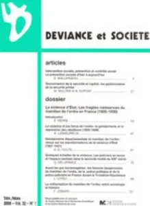 Volume 32, Issue 1 Vol. 32, 2008/1 - pagesPages 3 to 20Social Intervention, Prevention, and Social ControlBy Évelyne BaillergeauPages 21 to 42Security Governance and Capital: Private Security ManagersBy Massimiliano Mulone, Benoît DupontPages 43 to 45State Violence: The Fragile Beginnings of Riot Control in France (1800–1930)By Éric PierrePages 47 to 59Violence by a Police Force: The French Gendarmes and the Control of Uprisings (1800–1859)By Aurélien LignereuxPages 61 to 74The Departmental Gendarmerie and Riot Control: A Retrospective Look at Changes in State Violence (1827–1931)By Arnaud-Dominique HoutePages 75 to 88An Analytical Scale of ViolenceBy Quentin DeluermozPages 89 to 100Before Tear GasBy Laurent LópezPages 101 to 109The Militarization of Riot Control: Between Sociology and HistoryBy Fabien Jobard