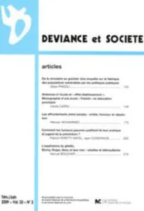 Volume 33, Issue 2 Vol. 33, 2009/2 - pagesPages 123 to 124In Memoriam: Louk HulsmanPages 125 to 148Asylum-Seekers in FranceBy Gilles FrigoliPages 149 to 172School Violence and School-Based ManagementBy Cécile CarraPages 173 to 204Conflicts between Gangs: Masculinity, Honor, and ReputationBy Marwan MohammedPages 205 to 219How Do Poor Smokers Justify Their Habit and How Do They View Prevention Efforts?By Patrick Peretti-Watel, Jean ConstancePages 221 to 248The Experience of the GhettoBy Manuel Boucher