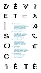 Volume 41, Issue 2 Vol. 41, 2017/2 - pagesPages 167 to 201Biosocial Criminology through the Lens of Field Theory. The Resources and Strategies Used in a Dominated Field of US CriminologyBy Julien LarreguePages 203 to 237Political Conflict, Violence and Denunciation: Women as “Protagonists of Resentment” in the North-east of BrazilBy Irlys Alencar Firmo BarreiraPages 239 to 271The Evolution of Municipal Police forces in France: An Imitation of State Police Doomed to Failure?By Laurent MucchielliPages 273 to 304Limited Diversity. Young People from the Working Classes and Citizenship Education in “Politique de la ville” AreasBy Sylvain BordiecPages 305 to 330Humiliation on the Internet: A New Form of Cyberdelinquency?By Julie Alev Dilmaç