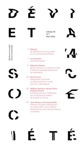 Volume 44, Issue 1 Vol. 44, 2020/1 - pagesPages 3 to 4In defense of public service in scientific researchPages 7 to 9Christophe AdamPages 11 to 48Racial slurs and social status: Making use of verbatim transcription from the “Cadre de Vie et Sécurité” French national victimization surveyBy Sébastien DelarrePages 49 to 81House arrest and supervisors’ practices in a negotiated orderBy Elsa EuvrardPages 83 to 110Absolute power? Elements of the sociology of football referees in FranceBy Williams Nuytens, Nicolas Penin, Grégoire DuvantPages 111 to 141Educating young offenders in penal centers: Reasons for placement at the heart of complex dynamicsBy Jean Sanzane, Dominique Bodin