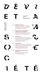 Volume 44, Issue 3 Vol. 44, 2020/3 - pagesPages 347 to 382Patterns of punitiveness. Popular attitudes toward gender-based violence in France and GermanyBy Bénédicte LaumondPages 383 to 419Dieudonné: Anti-Semitism, moral panics and deviant communityBy Serge Proust, Jérôme Michalon, Marine Maurin, Camille NoûsPages 420 to 452Reporting “risk of radicalization” in schools in Fance: A new tool for regulating IslamBy Claire DonnetPages 453 to 483Access to accommodation in Marseille: Rights, enforcement practices, obstacles and issuesBy Camille AllariaPages 484 to 511Dangerous games in secondary schools, a spatial analysisBy Thibaut Hebert, Mickaël Vigne, Éric Dugas
