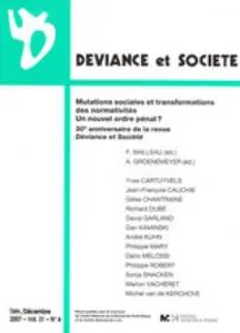 Volume 31, numéro 4 Vol. 31, 2007/4 - pagesPages 371 à 374Introduction pour le 30e anniversaire de la revuePar Francis Bailleau, Axel GroenemeyerPages 387 à 403Adaptations politiques et culturelles des sociétés à forte criminalitéPar David GarlandPages 405 à 419Une criminologie critique modernisatrice ? Par Dario MelossiPages 421 à 444La normativité à l'épreuve Par Axel GroenemeyerPages 445 à 464La criminologie et ses objets paradoxaux : retour sur un débat plus actuel que jamais ?Par Yves CartuyvelsPages 465 à 485Enjeux autour de l'évolution du droit criminel moderne Par Richard Dubé, Jean-François CauchiePages 487 à 504Mutations dans le champ des peines et de leur exécutionPar Dan Kaminski, Sonia Snacken, Michel van de KerchovePages 505 à 526L’état en retrait ? Trente ans d’usages des peinesPar Gilles Chantraine, André Kuhn, Philippe Mary, Marion Vacheret