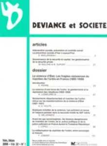 Volume 32, numéro 1 Vol. 32, 2008/1 - pagesPages 3 à 20Intervention sociale, prévention et contrôle social Par Évelyne BaillergeauPages 21 à 42Gouvernance de la sécurité et capital : les gestionnaires de la sécurité privéePar Massimiliano Mulone, Benoît DupontPages 43 à 45La violence d'Etat. Les fragiles naissances du maintien de l'ordre en France (1800-1930)Par Éric PierrePages 47 à 59La violence d'une force de l'ordre : la gendarmerie et la répression des rébellions (1800-1859)Par Aurélien LignereuxPages 61 à 74Gendarmerie départementale et maintien de l'ordre : retour sur les transformations de la violence d'Etat (1827-1931)Par Arnaud-Dominique HoutePages 75 à 88Quelques échelles de la violence Par Quentin DeluermozPages 89 à 100Avant les gaz lacrymogènes Par Laurent LópezPages 101 à 109La militarisation du maintien de l'ordre, entre sociologie et histoirePar Fabien Jobard