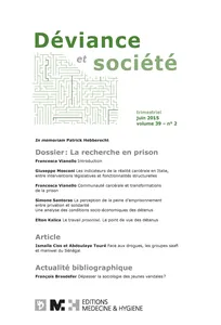 Volume 39, numéro 2 La recherche en prisonVol. 39, 2015/2 - pagesPages 127 à 128In memoriam Patrick Hebberecht (1951-2015)Pages 129 à 132IntroductionPar Francesca VianelloPages 133 à 150Les indicateurs de la réalité carcérale en Italie, entre interventions législatives et fonctionnalités structurellesPar Giuseppe MosconiPages 151 à 169Communauté carcérale et transformations de la prisonPar Francesca VianelloPages 171 à 188La perception de la peine d’emprisonnement entre privation et solidaritéPar Simone SantorsoPages 189 à 207Le travail prisonisé Le point de vue des détenusPar Elton KalicaPages 209 à 224Face aux drogues, les groupes saafi et maniwel du SénégalPar Ismaïla Ciss, Abdoulaye TourePages 225 à 241Dépasser la sociologie des jeunes vandales ?Par François Brasdefer