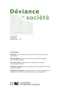 Volume 40, numéro 2 Vol. 40, 2016/2 - pagesPages 139 à 164La police française à la lumière de la théorie de la justice procéduralePar René LévyPages 165 à 186Le droit hors de compte. L’aiguillage managérial de la discrétion policièrePar Pierre ThéveninPages 187 à 200La légitimation de la violence selon le genre et le contexte en TunisiePar Dorra Ben AlayaPages 201 à 226Parcours de travailleuses du sexe offrant des services d’escorte au QuébecPar Jacqueline ComtePages 227 à 244L’« imaginaire pénal » : penser les significations sociales de la punition du côté des espaces sociaux marginalisésPar Benoit Décary-Secours