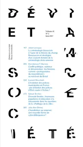 Volume 41, numéro 2 Vol. 41, 2017/2 - pagesPages 167 à 201La criminologie biosociale à l’aune de la théorie du champ. Ressources et stratégies d’un courant dominé de la criminologie états-uniennePar Julien LarreguePages 203 à 237Conflit politique, violence et dénonciation : les femmes comme « protagonistes du ressentiment » au nord-est du BrésilPar Irlys Alencar Firmo BarreiraPages 239 à 271L’évolution des polices municipales en France : une imitation des polices d’État vouée à l’échec ?Par Laurent MucchielliPages 273 à 304Diversité limitée. Jeunesses populaires et éducation à la citoyenneté dans les quartiers de la « Politique de la ville »Par Sylvain BordiecPages 305 à 330L’humiliation sur Internet : Une nouvelle forme de cyberdélinquance ?Par Julie Alev Dilmaç