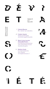 Volume 43, numéro 1 Vol. 43, 2019/1 - pagesPages 3 à 39Du « radical » au « radicalisé »Par Clément BeunasPages 41 à 75Quand psychologues et policiers jugent ensemble : le recrutement des gardiens de la paix en FrancePar Frédéric GautierPages 77 à 110Les trajectoires des femmes sans domicile à travers le prisme du genre : entre vulnérabilité et protectionPar Marie Loison, Gwenaëlle PerrierPages 111 à 151Le mixed martial arts, une « atteinte à la dignité humaine » ?Par Matthieu Quidu