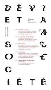 Volume 44, numéro 3 Vol. 44, 2020/3 - pagesPages 347 à 382Punitivité comparée. Les cadrages ordinaires des violences de genre en Allemagne et en FrancePar Bénédicte LaumondPages 383 à 419Dieudonné : antisémitisme, panique morale et communauté déviantePar Serge Proust, Jérôme Michalon, Marine Maurin, Camille NoûsPages 420 à 452Les signalements pour « risque de radicalisation » dans les établissements scolaires en France, nouvel outil de régulation de l’islamPar Claire DonnetPages 453 à 483L’application du droit à l’hébergement comme enjeu sanitaire et économique : étude sociologique de l’accès à l’hébergement à MarseillePar Camille AllariaPages 484 à 511Les jeux dangereux au collège, une approche spatialePar Thibaut Hebert, Mickaël Vigne, Éric Dugas