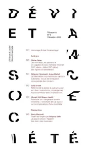 Volume 44, numéro 4 Vol. 44, 2020/4 - pagesPages 523 à 524In memoriamPar Le comité de rédactionPages 525 à 559Les nomades, les paysans et les vagabonds dans l’Empire ottoman (XIIIe siècle – début XXe siècle) : des figures de désaffiliés ?Par Olivier GajacPages 561 à 596La fabrication sous tension de rapports judiciaires : le cas de l’évaluation socio-pénale des mineursPar Rébecca Chouinard, Joane MartelPages 597 à 632Réforme de la police et policy transfer au Liban : traductions, convergences et concurrences dans un État diviséPar Leïla SeuratPages 633 à 663Fabriquer un « dangereux ennemi terroriste » : une étude de cas suisse sur les implications d’une prophétiePar Ahmed Ajil, Manon JendlyPages 665 à 684Le jazz en prison : l’apport des récits des musiciensPar Barry Maxwell, traduction Grégory Salle