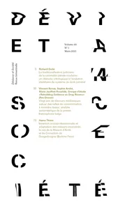 Volume 49, numéro 1 Vol. 49, 2025/1 - pagesPages I à 2Pages de débutPages 3 à 37La traditionalisation judiciaire de la rationalité pénale moderne : un obstacle ontologique à l’évolution identitaire du système de droit criminelPar Richard DubéPages 39 à 72Vingt ans de discours médiatiques autour des salles de consommation à moindre risque : analyse textométrique de la presse francophone belgePar Vincent Roose, Sophie André, Marie Jauffret-RoustidePages 73 à 104Insertion socioprofessionnelle et adaptation des mineurs incarcérés : le cas de la Maison d’Arrêt et de Correction de Ouagadougou (Burkina Faso)Par Hama ThieniPages 105 à 107Conditions de publicationPages 108 à 109Pages de fin